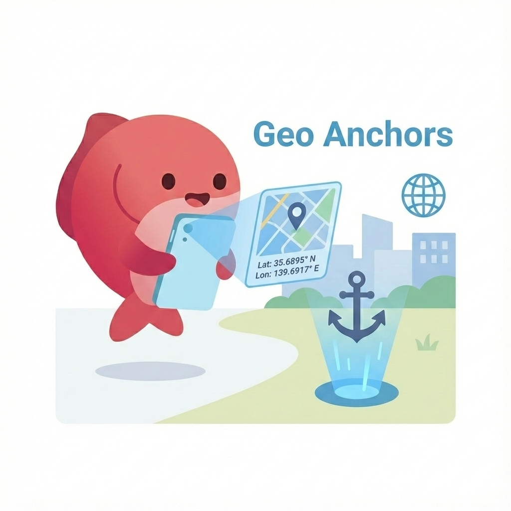 Geo Alignment/GeoAnchors提案を用い、緯度経度に基づくアンカー配置(VPS連携想定)。
