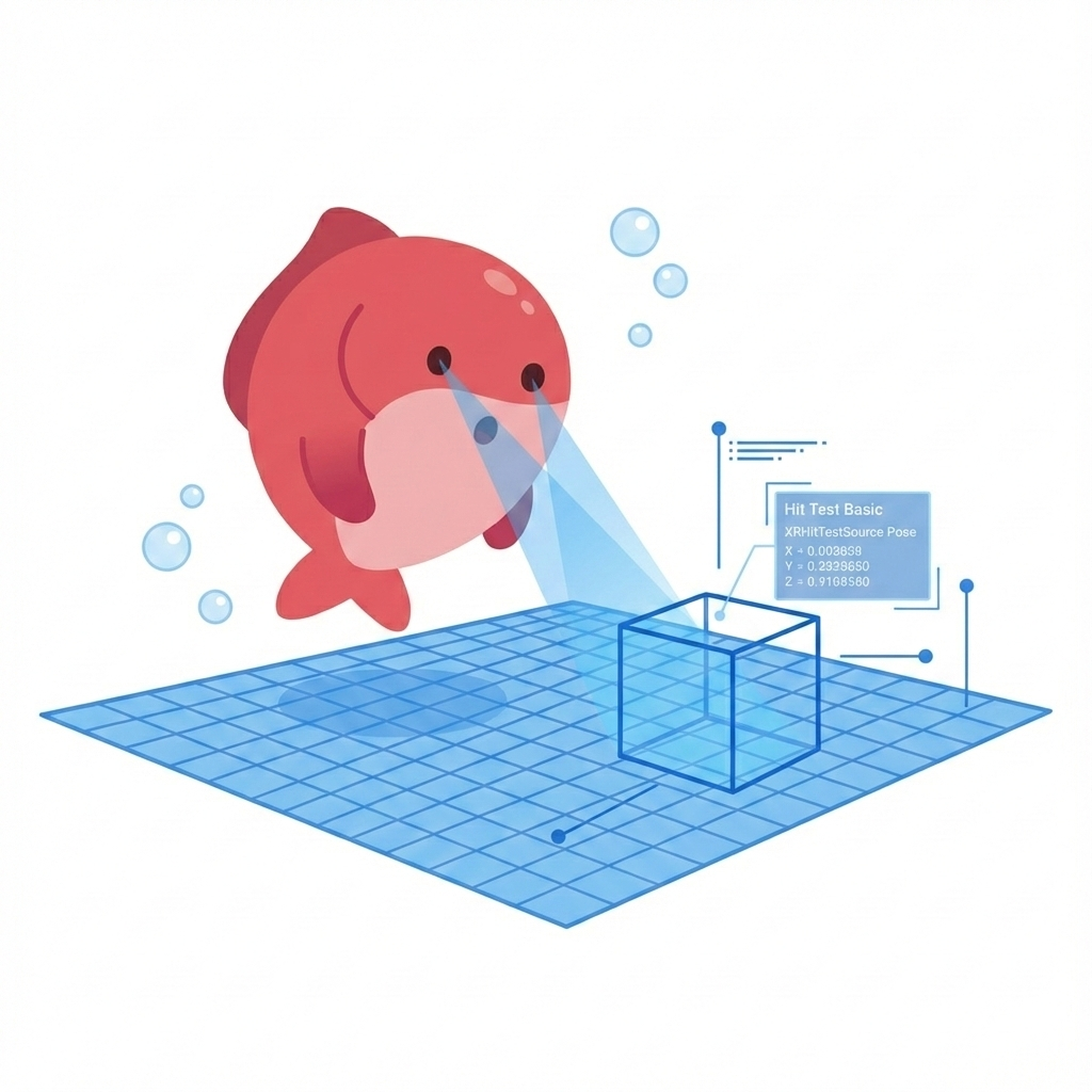 XRHitTestSourceで得たポーズを可視化し、検出平面にオブジェクトを配置する基本パス。
