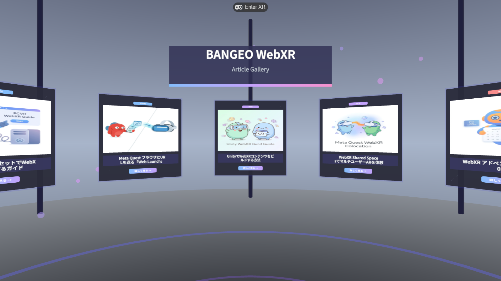MetaのImmersive Web SDKで構築したVR空間内の記事閲覧ギャラリー。BANGEOのブログ記事をVR内で読むことができます。